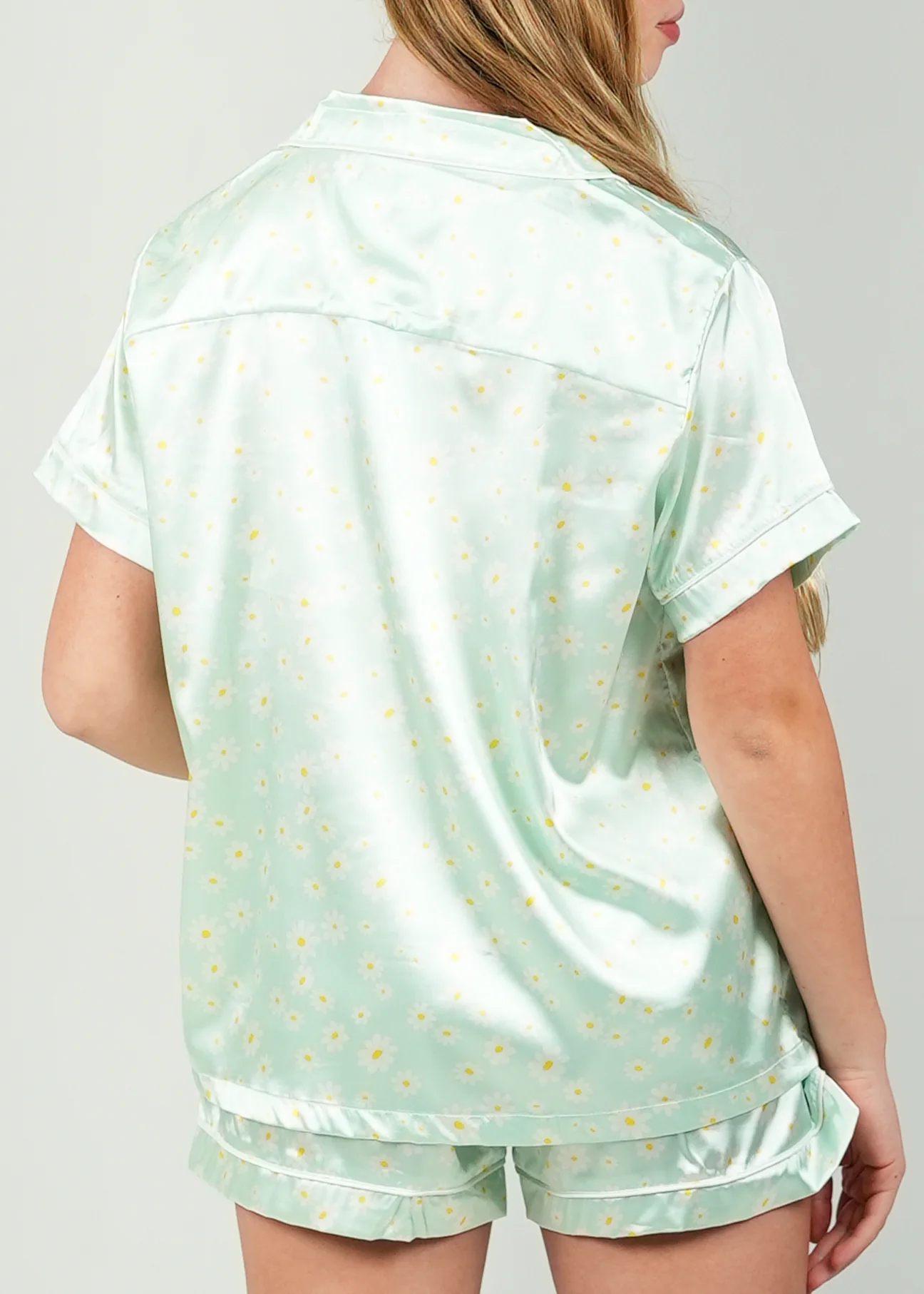 Frolic through the fields of endless daisies in our Green Daisy Short Satin Pajamas. With deep pockets, adorable buttons, and an extra stretchy waistband for the ultimate comfort experience, you are sure to have the most luxurious sleep.