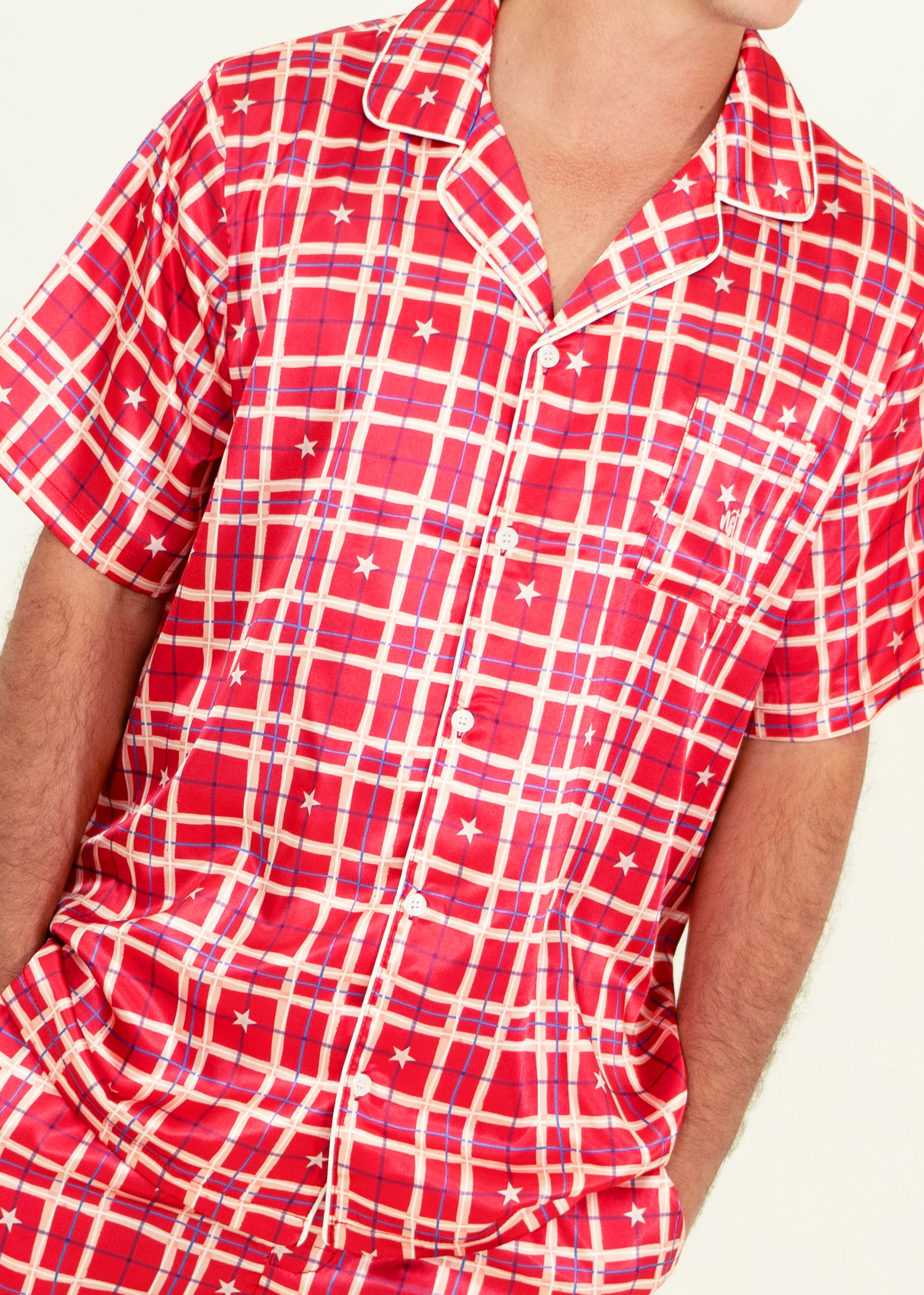 Mens Starry Tartan Red Satin Short Sleeve/Long Pants Pj Set