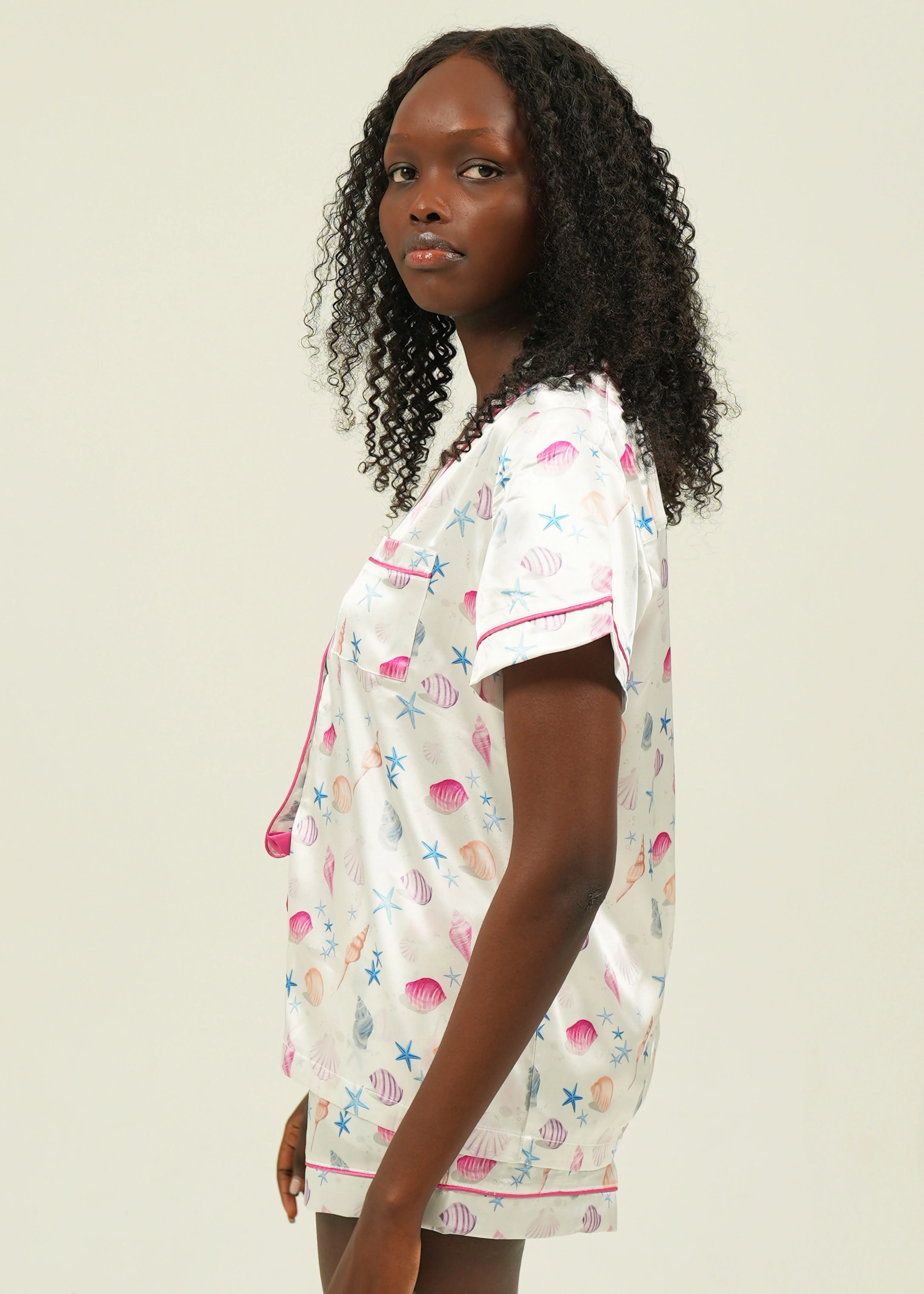 Feel the softness of the ocean on your body in our silky smooth Seashells Satin Pajamas. Crafted with deep pockets, a stretchy drawstring waistband, and buttery soft fabric, you are sure to have the most luxurious sleep.