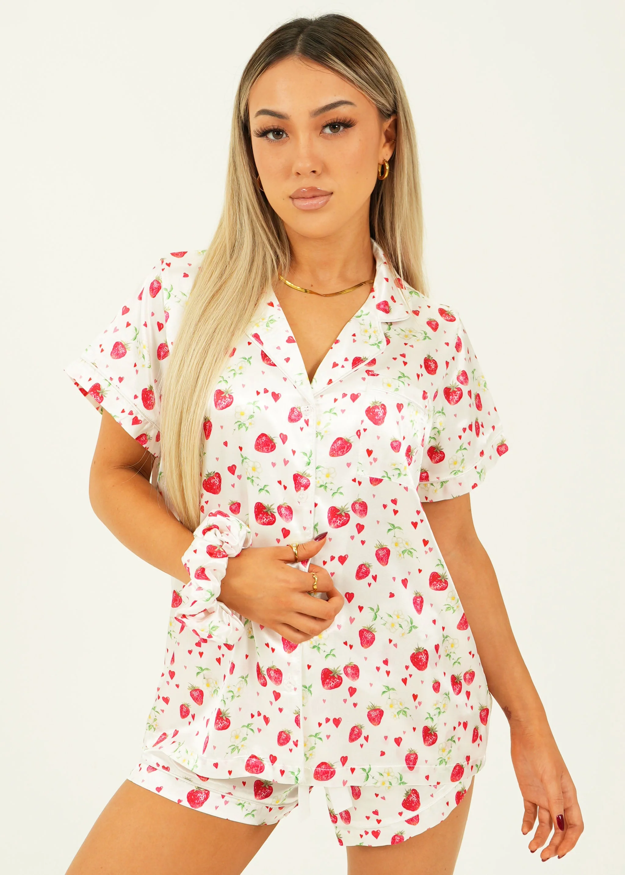 Add a touch of fruity goodness to your bedtime with our gorgeous Strawberries Satin Pajamas. Beautifully detailed with deep pockets, adorable buttons, and an extra stretchy drawstring waistband, you are sure to have a peachy keen sleep!